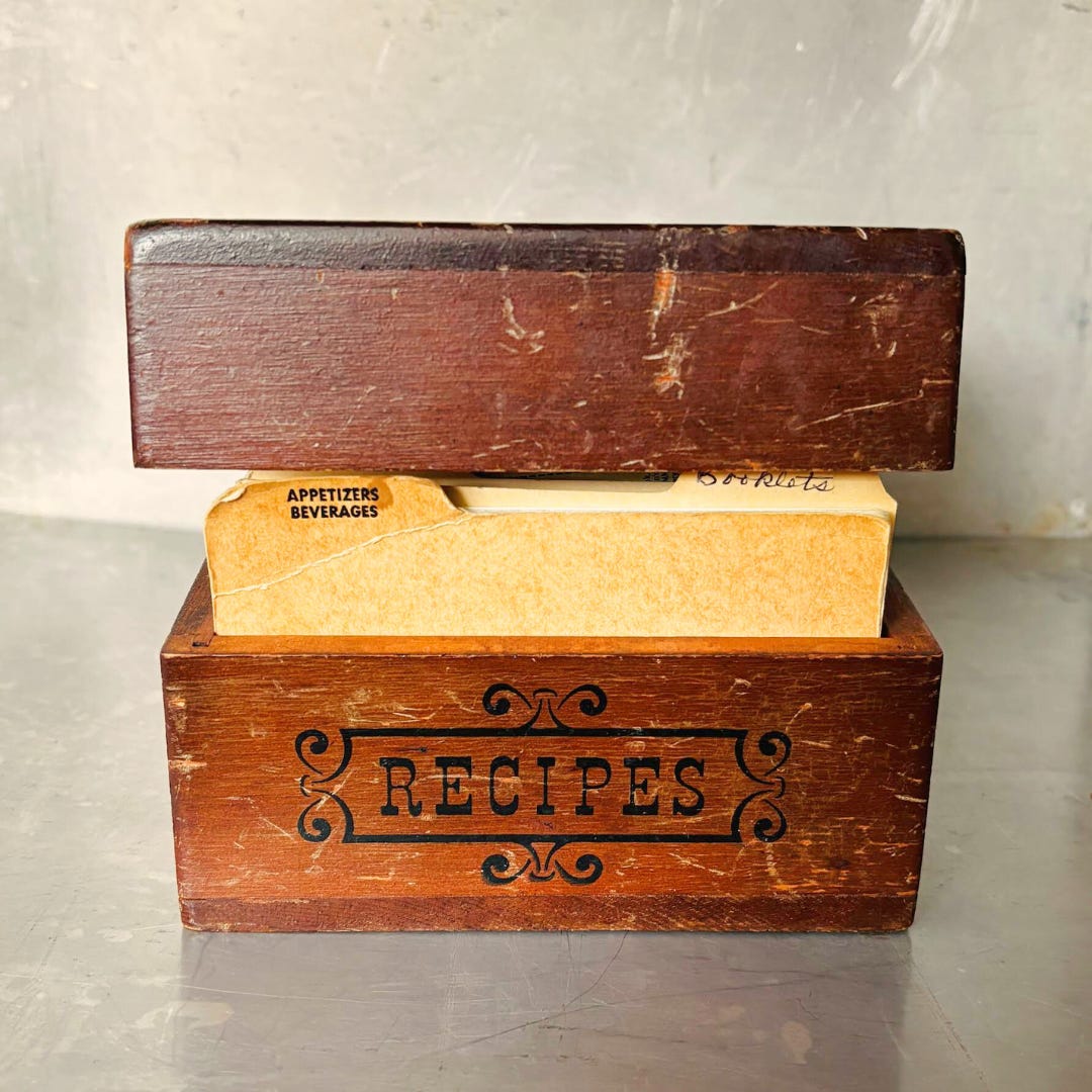 I came across the box during the rushed cleanout of my mother’s independent-living apartment. I thought my sister would want it for one of her three daughters, but they get all their recipes online. I made room in my bag.